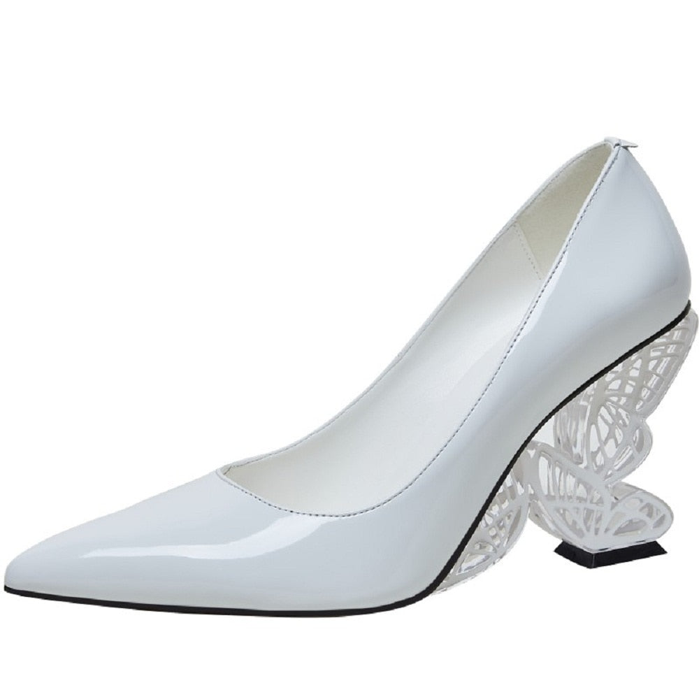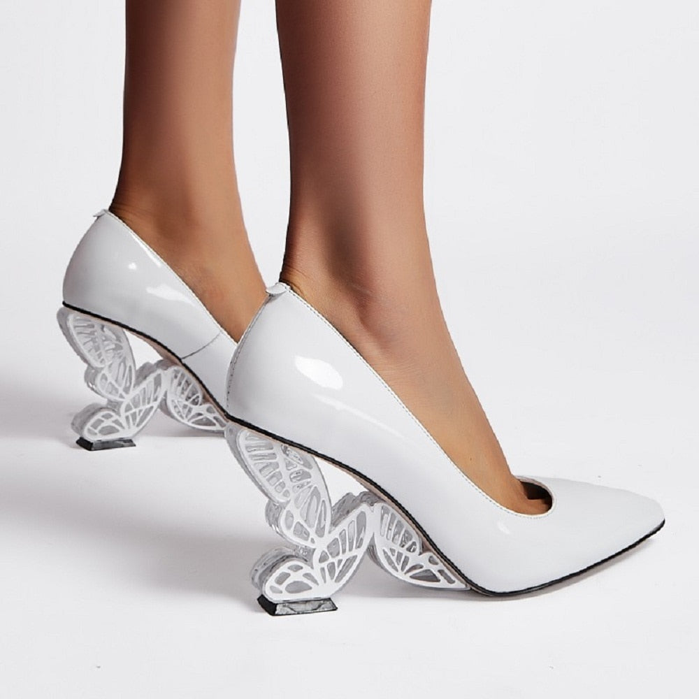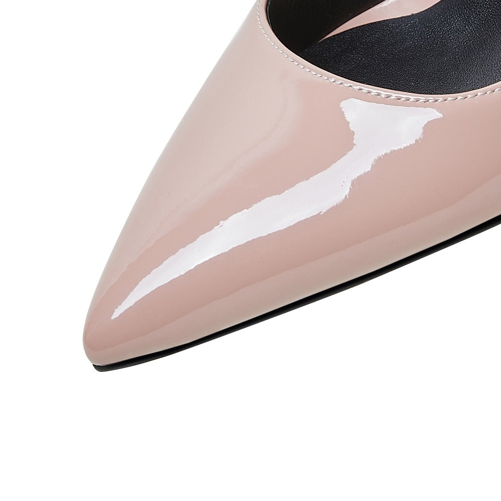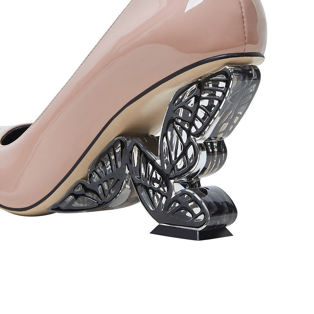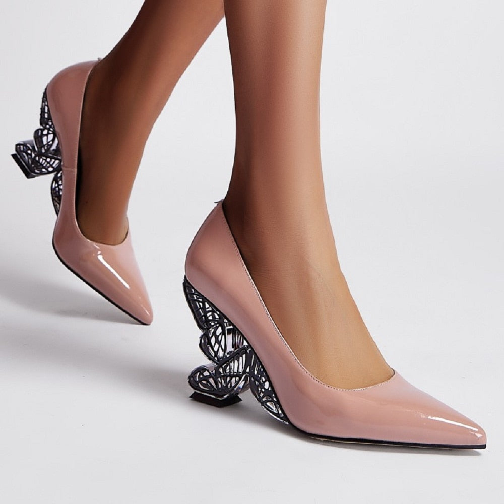 A distinctive heel elevates the artistic appeal of this pointy-toe pump crafted from smooth lacquer leather.